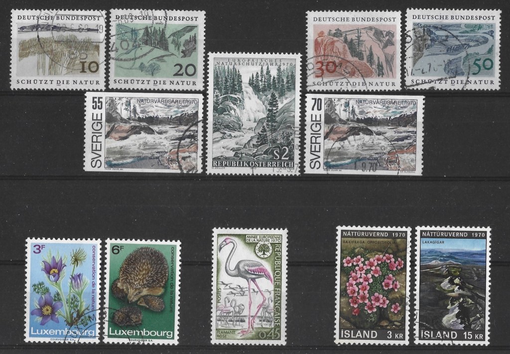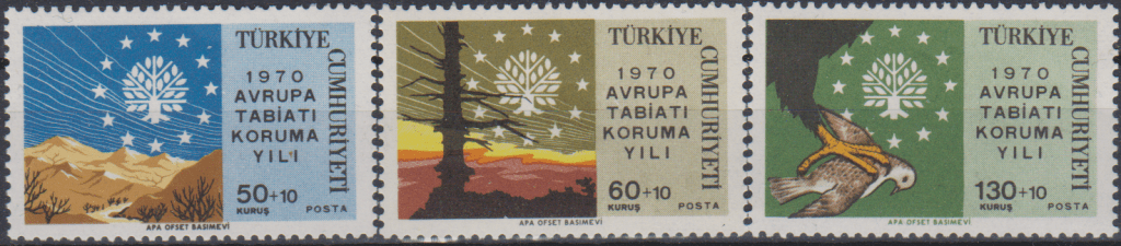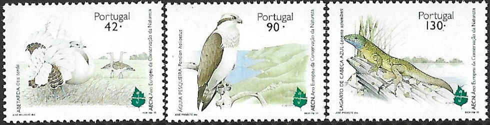 Portugal: Europees jaar voor behoud van de natuur. Van links naar rechts: grote trap, visarend en smaragdhagedis.