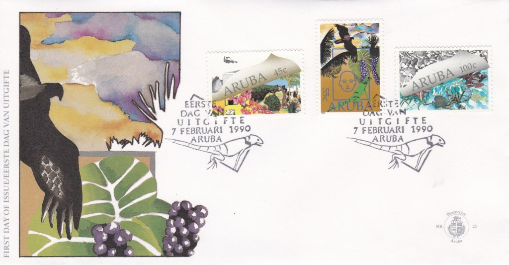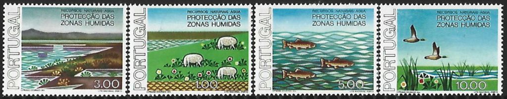 De relatie tussen planten en dieren en hun milieu: aarde, water en lucht wordt op deze zegels goed in beeld gebracht.