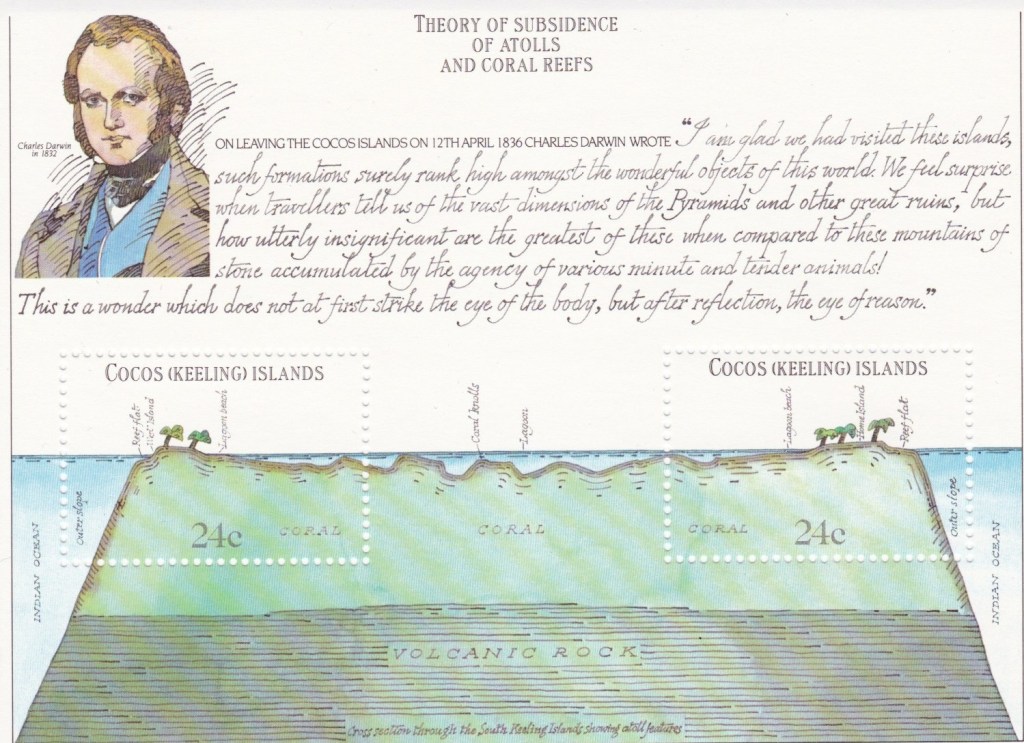 Op 12 april 1836 schreef Charles Darwin bij het verlaten van de Cocos eilanden in een brief over de geweldige indruk, die de schoonheid van de atollen en koraalriffen op hem hadden gemaakt. Daar vielen de geweldige piramiden van Egypte bij in het niet. Helaas worden de koraalriffen nu ook met uitsterven bedreigd.