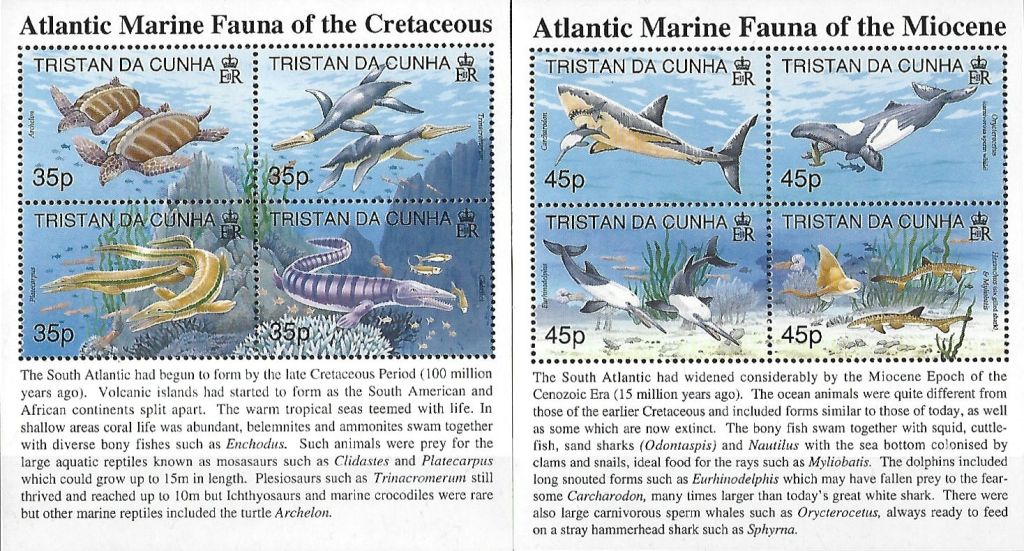 Evolutie zeedieren. Begint met de vorming van vulcanische eilanden, die Zuid Amerika en Afrika opsplitsen. Links de laatste periode van het krijt duurt tot en met het uitsterven van de dinosaurs. Rechts het mioceen, waarin de zeedieren al aardig op de huidige populatie lijken.