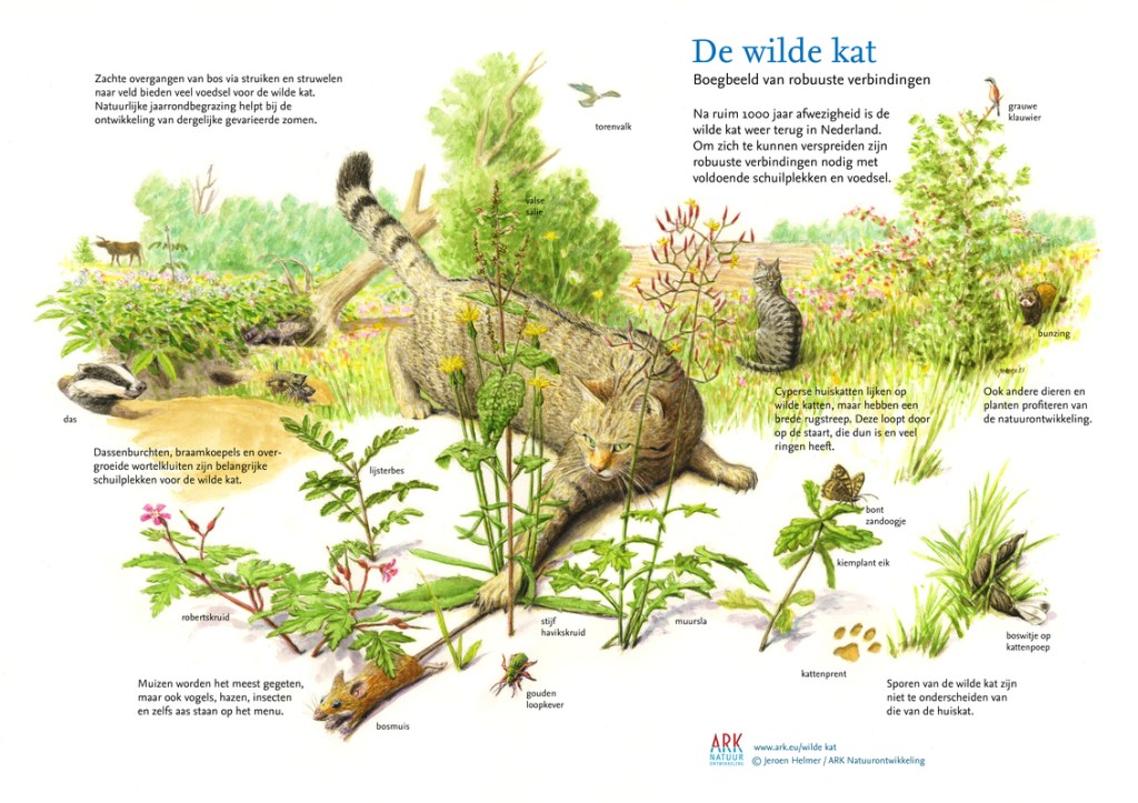 Na ruim 1000 jaar afwezigheid is de Europese wilde kat weer terug in Nederland. In het uiterste zuiden van Limburg leeft inmiddels een stabiele populatie. Op fluwelen voeten beweegt deze stoere kat zich langzaam noordwaarts. Om zich te kunnen verspreiden zijn verbindingen nodig met voldoende schuilplekken en voedsel. ARK Natuurontwikkeling werkt aan robuuste verbindingen waar niet alleen de wilde kat, maar ook andere dieren van profiteren. ARK tekenaar Jeroen Helmer bracht de wereld van de wilde kat in beeld. Het resultaat is voor iedereen gratis te downloaden. (Citaat : Ark natuurontwikkeling )